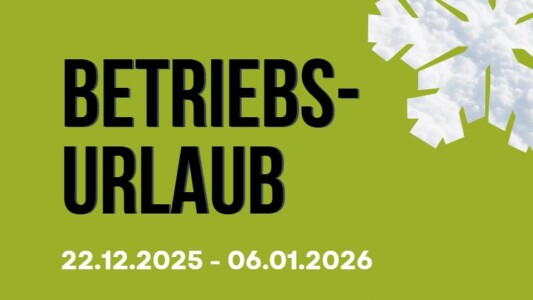 Wir legen vom 22. Dezember 2025 bis einschließlich 6. Januar 2026 eine Pause ein. Ab dem 7. Januar 2026 sind wir wieder voller Tatendrang und Energie für euch im Einsatz!