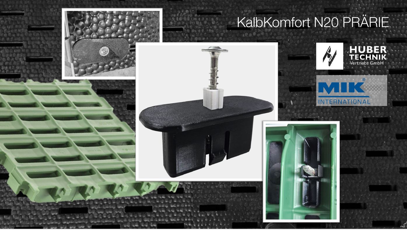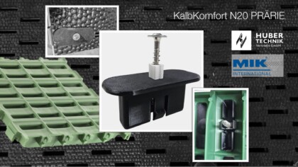 Reine Kunststoffroste sind künftig in der Kälberhaltung nicht mehr erlaubt. Die perforierte Spaltenauflage auf Basis des bewährten Komfortbelages N20, sichert zuverlässig den Kotdurchtritt, so dass Kälber nicht mehr als unvermeidbar mit Kot und Harn in Berührung kommen. Ihnen steht im Stall ein trockener, weicher und elastisch verformbarer Liegebereich zur Verfügung. Huber Technik Stallbeläge sind außerdem auf ihre Trittsicherheit getestet und ermöglichen jederzeit einen sicheren Stand und Gang. Gelenkschonendes Ablegen, Aufstehen und Laufen hat oberste Priorität. Um die Gummiauflage sicher und passgenau mit den MIK PRÄRIE Kunststoffrosten zu verbinden wurde ein spezielles Verbindungselement entwickelt.