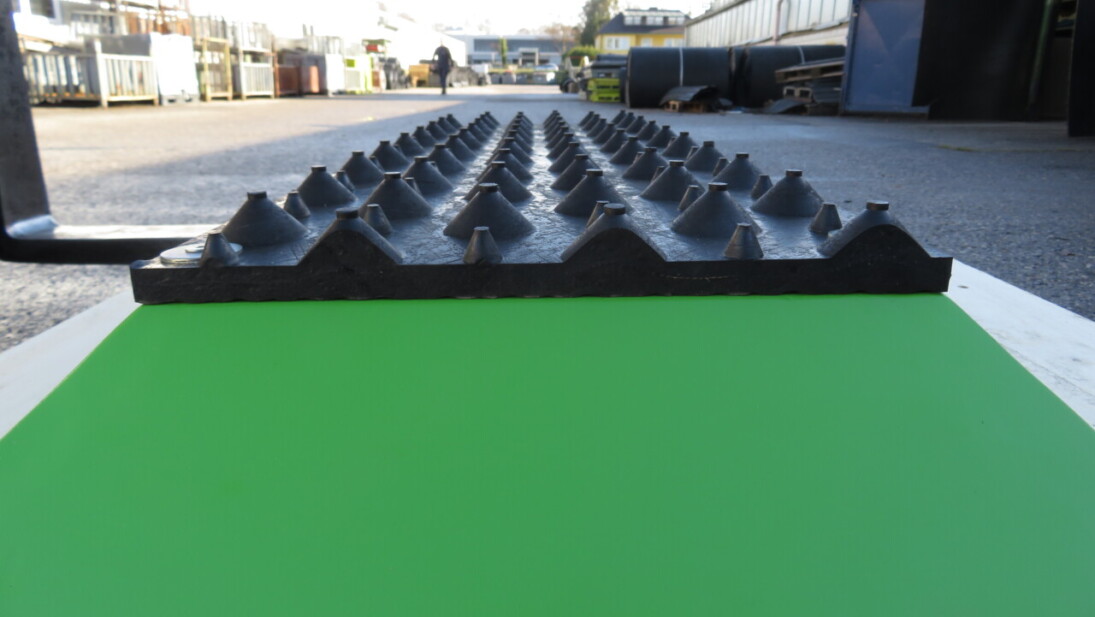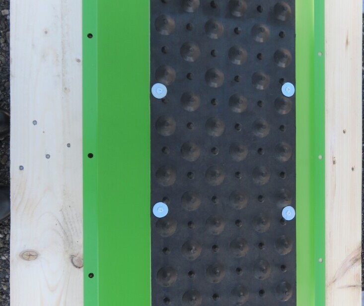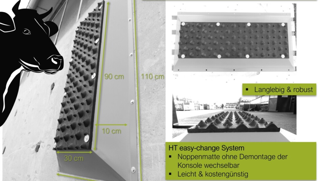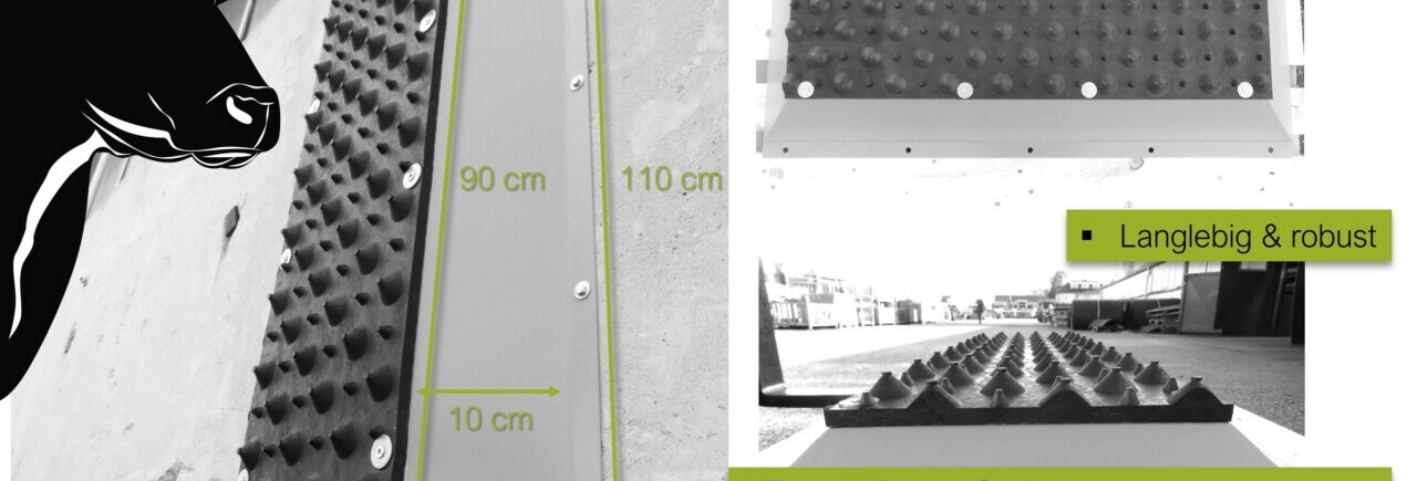 Die Gummimatte – Made in Germany – besitzt bis zu 20 mm starke Noppen und ist mit einer Größe von 300 x 900 mm ITW-konform in der Rindermast.